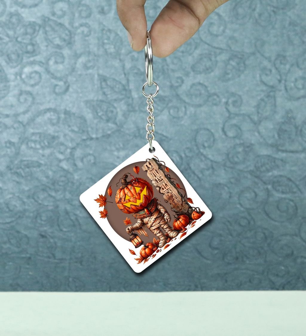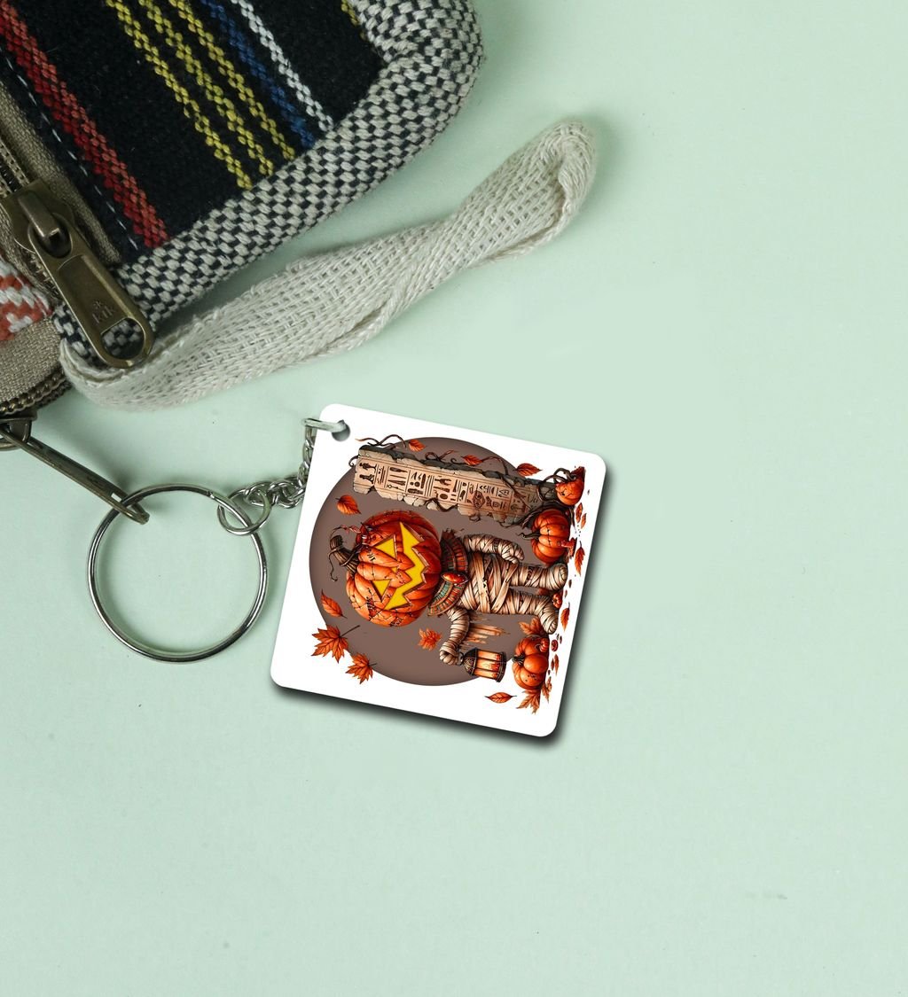 Creepy Jack-O'-Lantern Mummy Amid Autumn Pumpkins Printed Keychain Pack of 2
