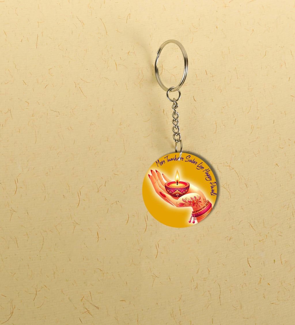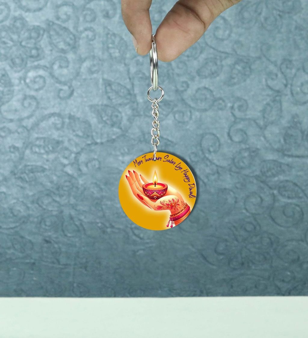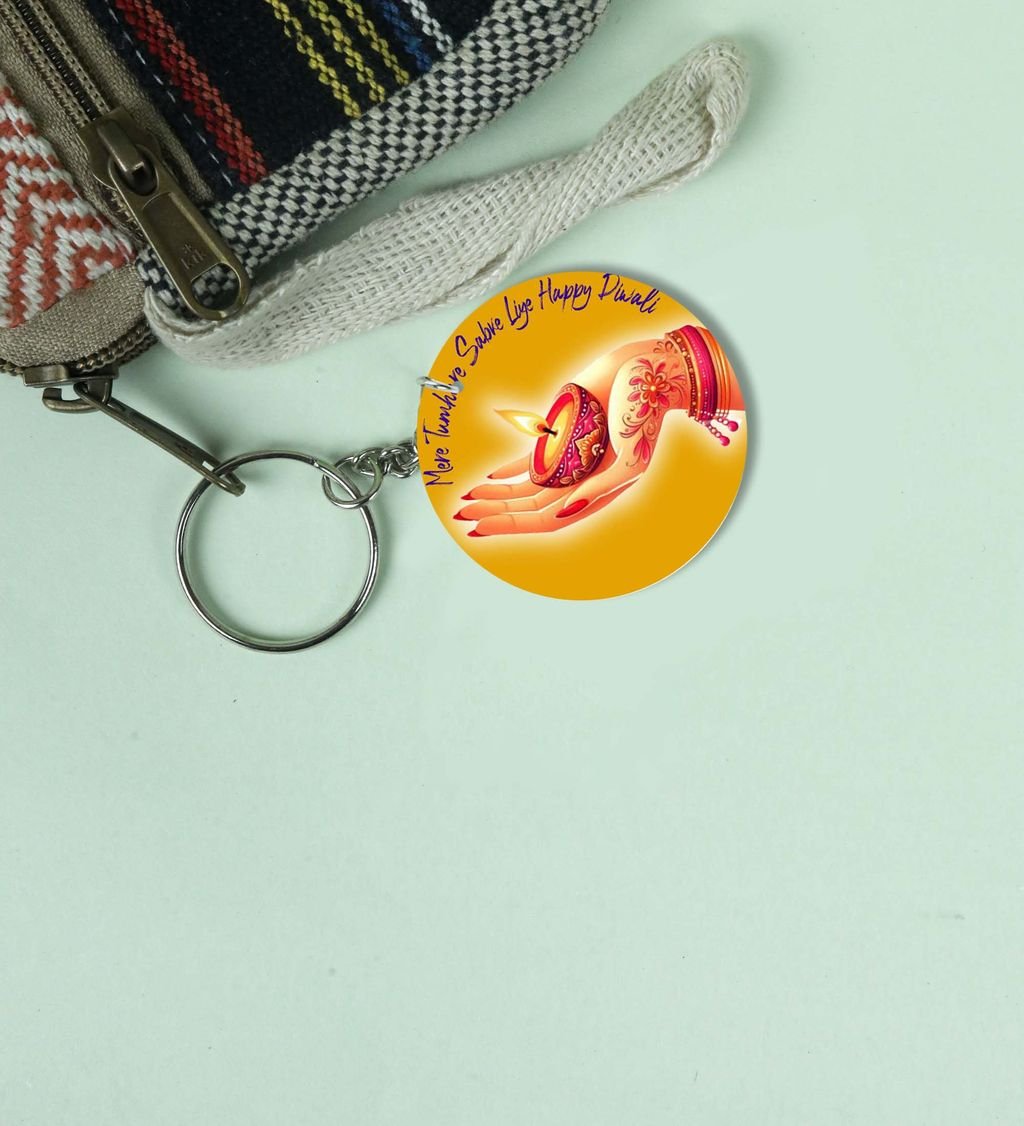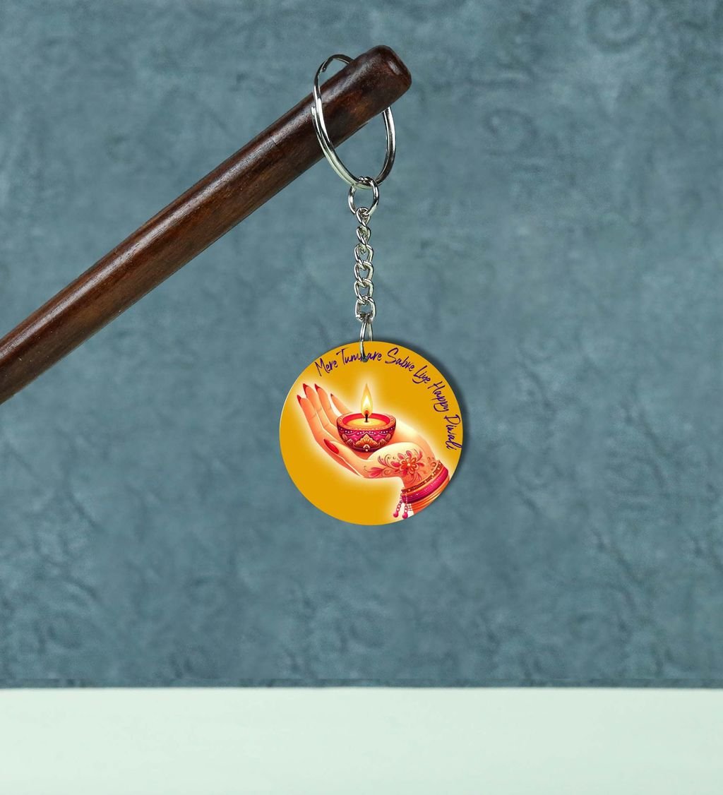 Elegant Hand Holding Diya for Diwali Celebration Printed Round Keychain Pack of 2